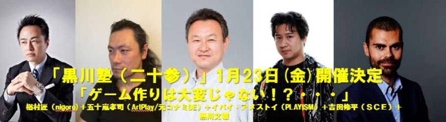 今回の黒川塾では、自らの理想を追い求めて、インディーズとしてゲーム開発にチャレンジする日本を代表するNIGOROの代表・楢村匠氏、大資本のもとを離れて新たなチャレンジに邁進する五十嵐孝司氏、そして、コミックの外語ローカライズをきっかけに、日本のゲームの海外版へのローカライズ、ゲームの販売ポータルアサイトを立ち上げたPLAYISMのイバイ・アメストイ氏、さらに、プレイステーションの立ち上げから20年、現在はプロジェクトモーフィアス開発メンバーである吉田修平氏の登壇いただきます。それぞれの立場におけるゲーム作りのスタンスのクロストークを行います。QAコーナーもございます。